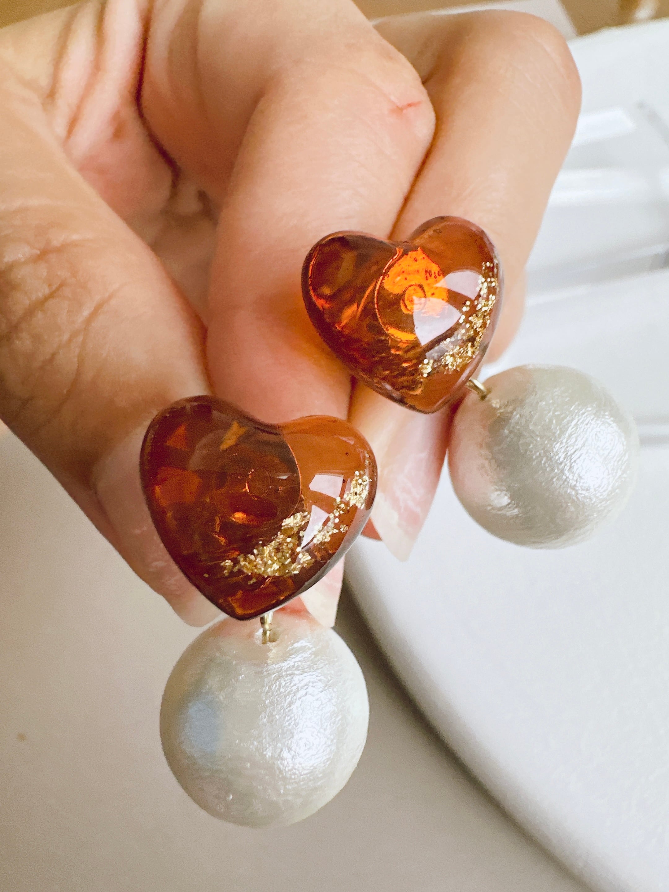 秋冬にピッタリの茶のハート♡ 1.5cm×1.5cmという小ぶりな大きさは普段使いにピッタリ✨ 1.6cmのコットンパールと合わせて、シンプルなデザインながらも存在感を出しました! パールのテリは顔色をよく見せてくれるので、乾燥してくすみがちなこれからの季節は温かみのあるコットンパールでトーンアップも一緒に出来ちゃいます! ニットにはもちろん、パーカーやデニムなどのボーイズライクなコーデにもこちらをつけて頂けば、あっという間に女度アップ! そんな使い方、オススメです☺️ そして、ピアスとイヤリング共にサージカルステンレス金具、2way仕様となっています 参観日などの派手にはしたくないけど、オシャレはしたい! そんな時はパールにはお留守番して頂いて✨️ ハートだけお使い頂けます(*^^*) そんな、使い勝手抜群のこちら、ぜひぜひこの秋冬コーデに取り入れてみてくださいね! 長さ 約3.5cm